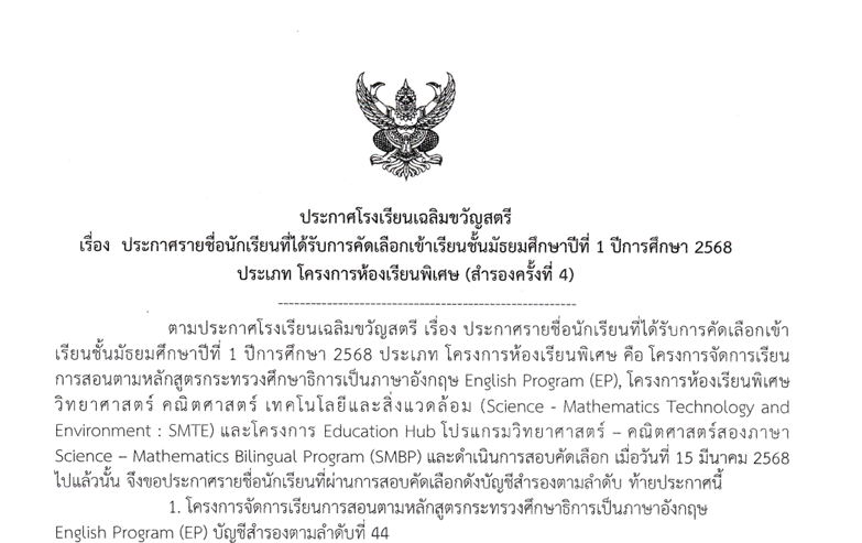 รายชื่อนักเรียนที่ได้รับการคัดเลือกเข้าเรียนชั...